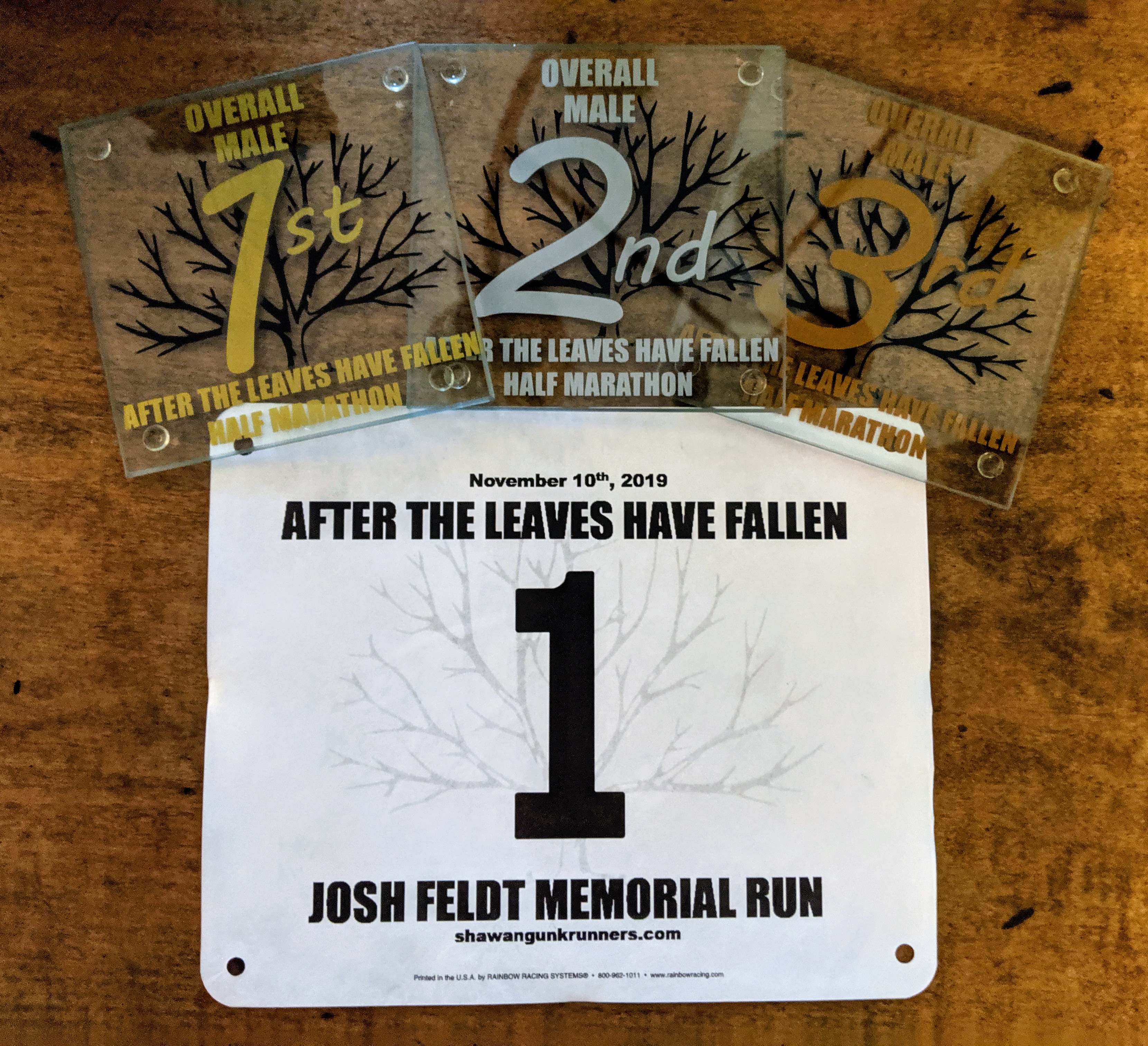 Also here’s a look at the bibs and Awards for this year as well. 3 deep in Overall, Masters and 10 year age groups